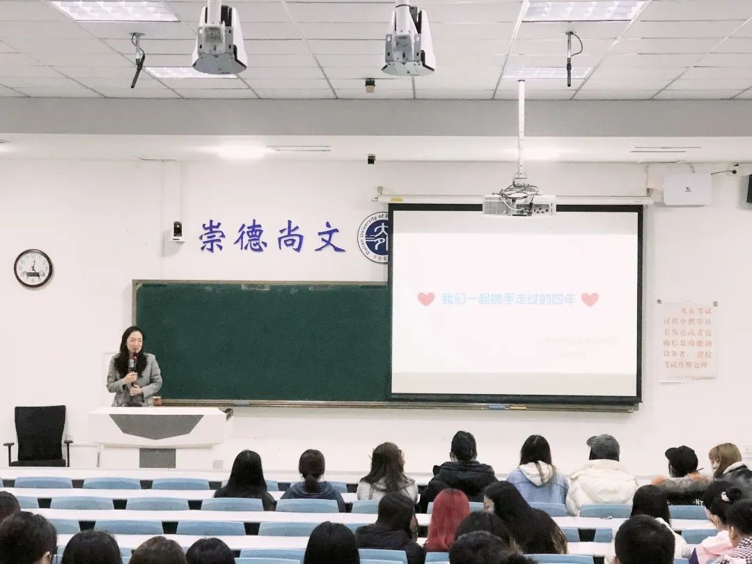 大会伊始,钟老师分享了2017级学生入学以来参加学习、活动的照片,带领大家一起重温大学四年共同度过的美好时光。结合目前就业形势,对学生进行了就业动员和指导,建议学生树立正确的就业观,找准自身定位,充分发掘各种可利用的资源,努力提升就业竞争力。并对学位证、毕业证、报到证及档案等诸项事宜进行解释和说明,帮助学生们理清毕业流程、处理好毕业事务。最后结合即将开展的毕业季系列活动,希望大家能够珍惜大学最后的相处时光,为自己的大学生活画上圆满的句号。
