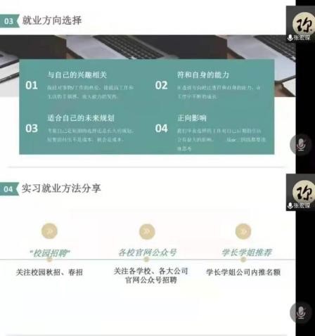 于腾讯会议开展就业经验线上分享会。两次分享会分别邀请到学院牛婉婷学姐、牛晴学姐、李雨浓学姐、张宏琛学姐作为主讲人,18级、19级以及20级学生参加此次分享会。