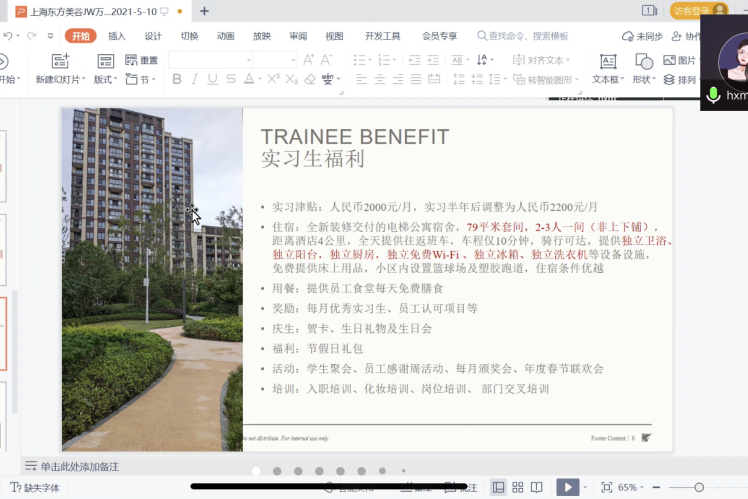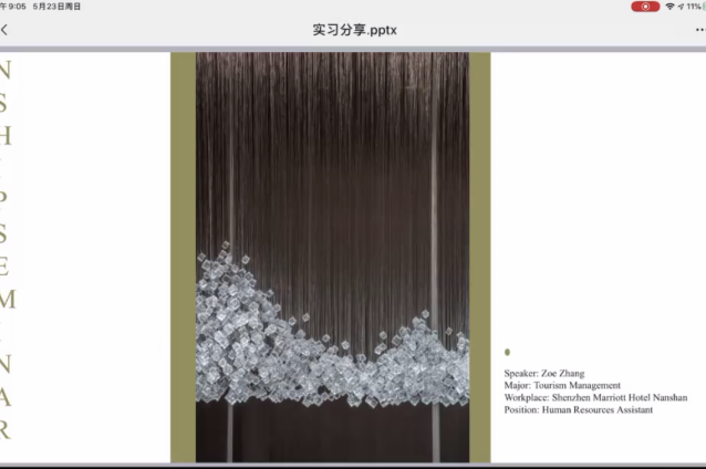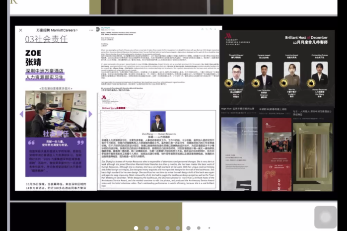 张靖学姐目前就职于深圳中洲万豪酒店,人力资源部实习生,负责薪酬绩效工作,目前已经拿到转正offer。她从自我介绍、岗位介绍、公司介绍、公司氛围、实习经历等方面为大家分享她成长的故事。讲述中学姐带领大家了解她在酒店的日常工作生活,分享了许多优秀晋升的职场示例,让大家感受到在万豪通过导师、培训等方式如何发掘一个职场精英的价值所在以及员工如何通过自己的努力实现人生价值体现与晋升。