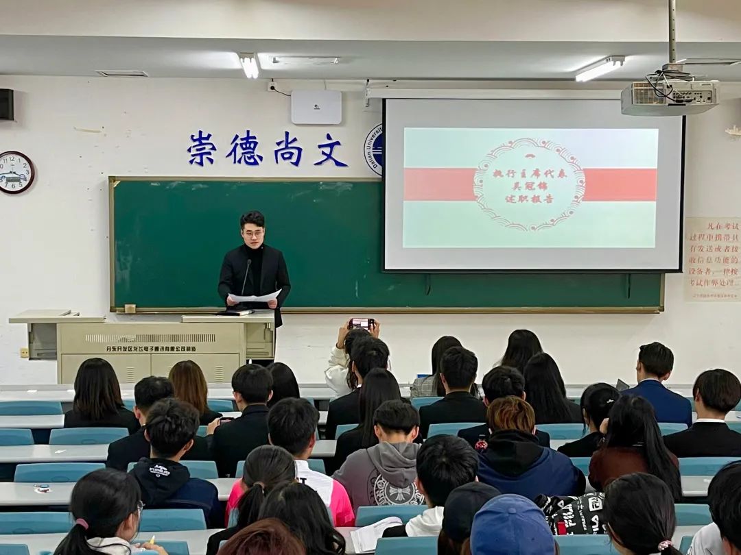 第四届分团委学生会执行主席2018级吴冠锦作为第四届主席团代表,做上一年度学生会工作述职报告。回顾了过去一年,在学生会各部门通力合作、相互配合下组织完成的各类赛事活动及取得的成绩,勉励新一届学生会成员继续发扬团结、努力、拼搏的精神,更好地为同学服务。