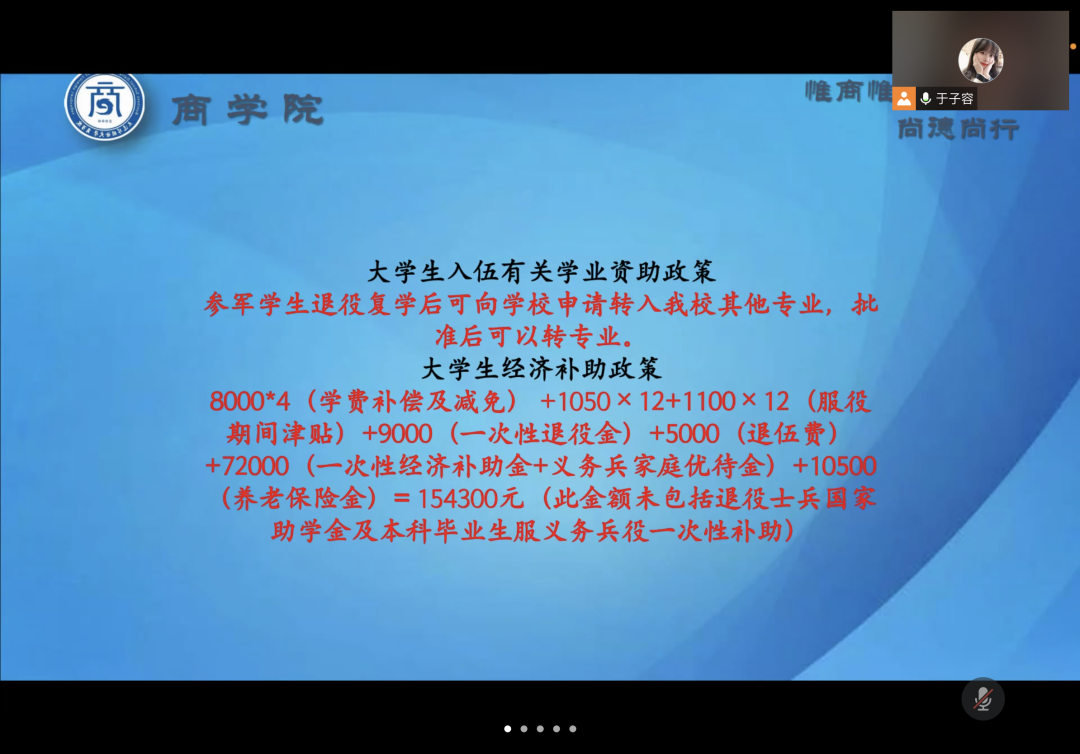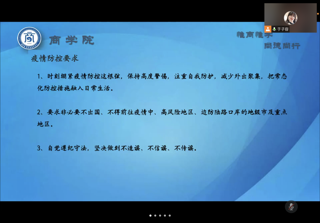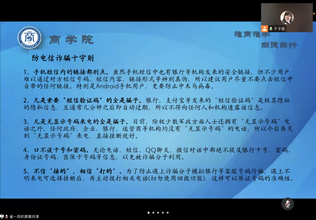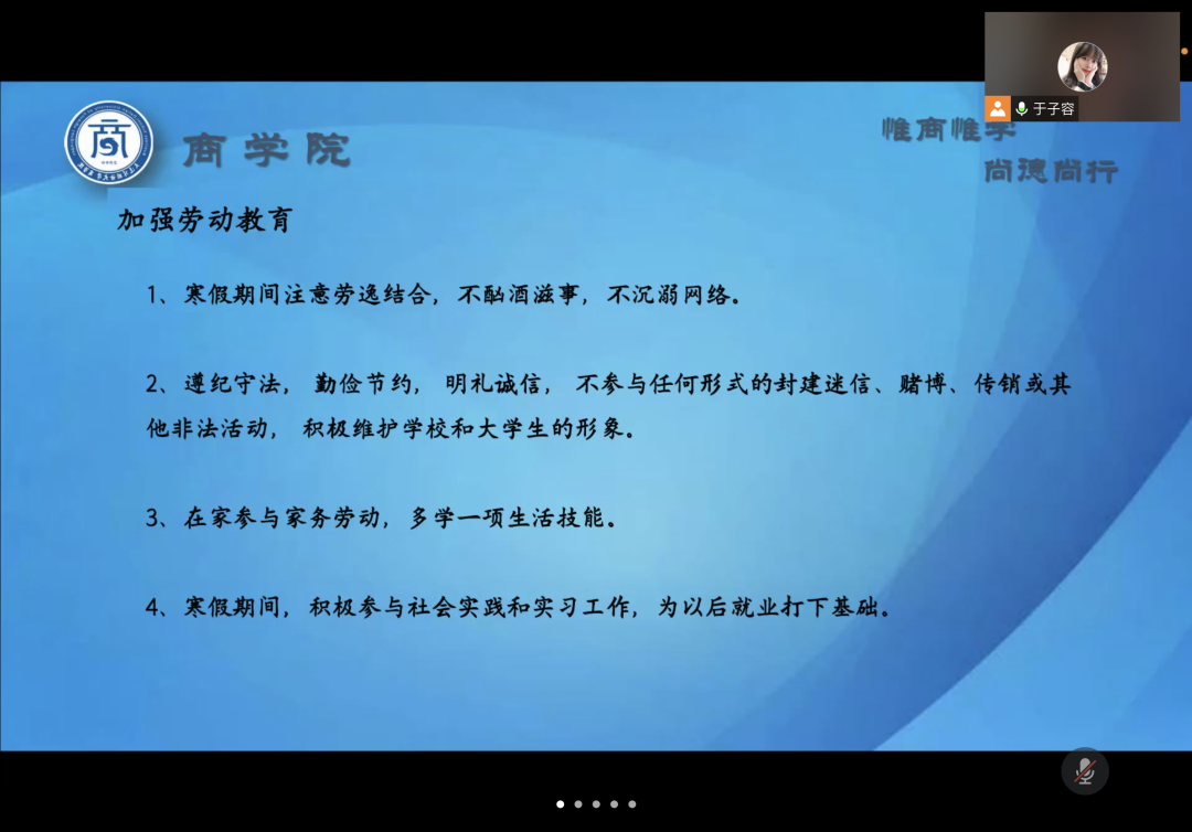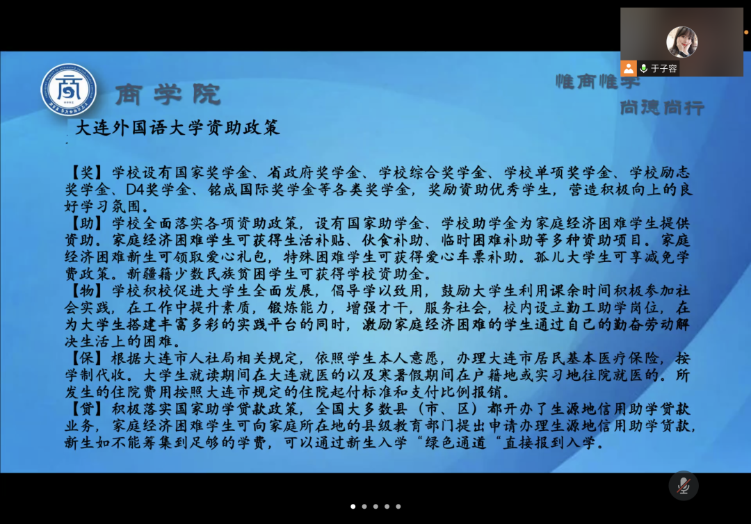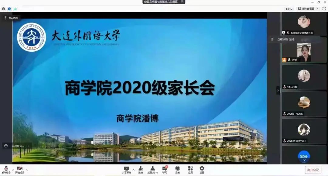 会议中,各位辅导员老师提醒同学们时刻绷紧疫情防控这根弦,保持高度警惕,注重自我防护,减少外出聚集,把常态化防控措施融入日常生活,同时希望家长起到督促作用。针对学生寒假期间生活,辅导员老师建议学生劳逸结合,提倡学生假期在家参与家务劳动,积极参与社会实践和实习工作,为以后就业打下基础。各位辅导员老师还结合现实事例在会议中也提醒大家谨防诈骗,普及了预防网络诈骗、电信诈骗的相关知识。各位辅导员老师还对大连外国语大学资助政策、大连市大学生城乡居民基本医疗保险有关政策和大连外国语大学2022年征兵宣传角度为家长进行了详细讲解。