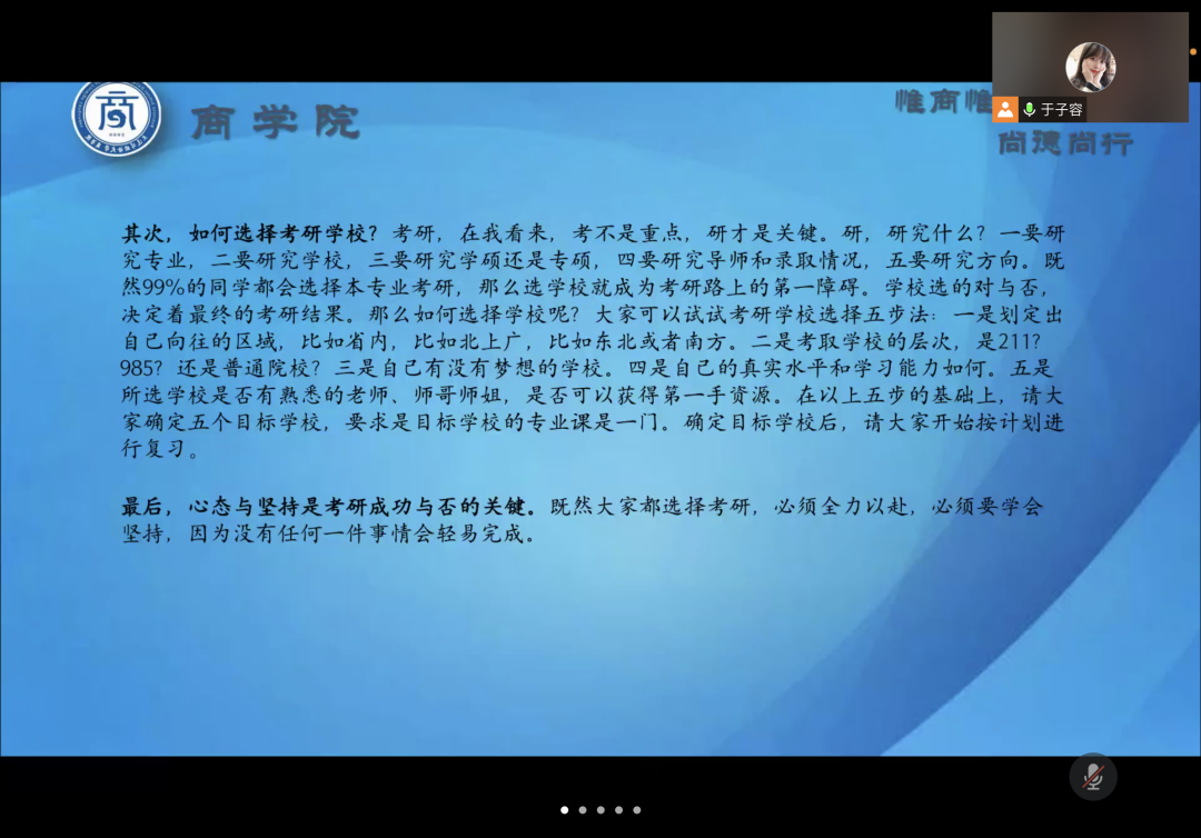 在2019级家长会上,辅导员于子容老师针对2019级本科生所处的大学生涯的重要时间节点,从同学们关于升学和就业的两个选择角度向学生和家长都提出了宝贵的意见和建议。对于有意向考研的同学,应明确目标,把握寒假时间,做好时间管理,家长则在其中起到督促和陪伴作用,做考研学生最有力的后盾。对于选择就业的同学,应利用假期补充完善个人简历,积极参与社会实践,家长应与学生开诚布公地探讨职业目标,并利用家长的人生经验助力学生更好地达成就业目标。