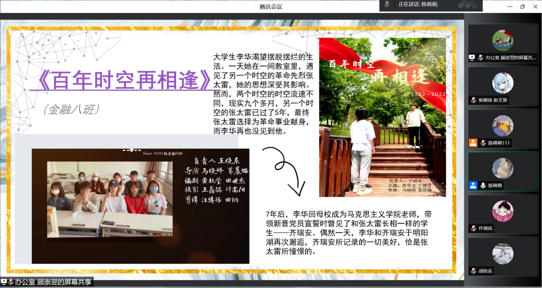 本届微电影大赛作品涉及庆祝建团百年、疫情下的校园生活、警惕电信诈骗、校园贷等多个方面,从剧本的精心挑选演绎,到视频拍摄剪辑和配音,历时一个半月的丰富与打造,一部部作品终于精心呈现在我们眼前。他们用独特的视角留影青春,用平凡的故事感动心灵,获得在场所有评委和观众的关注与认可。