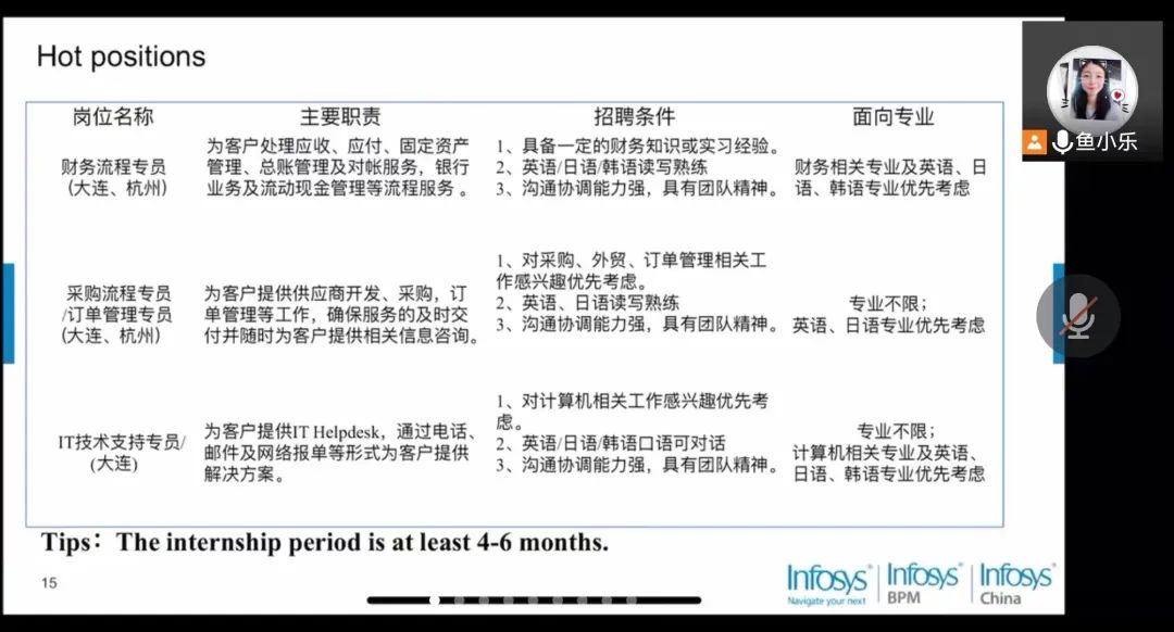 为进一步促进疫情下的2023届毕业生就业和各年级学生的实习工作顺利进行,提供更多学习和就业的选择与机会。5月18日,Infosys实习招聘宣讲会以线上的形式顺利开展。本次宣讲会由Infosys公司招聘人员主持,为同学们做出详细精彩的宣讲。