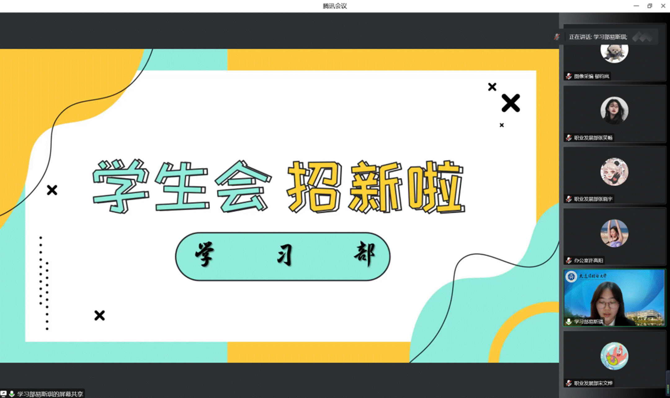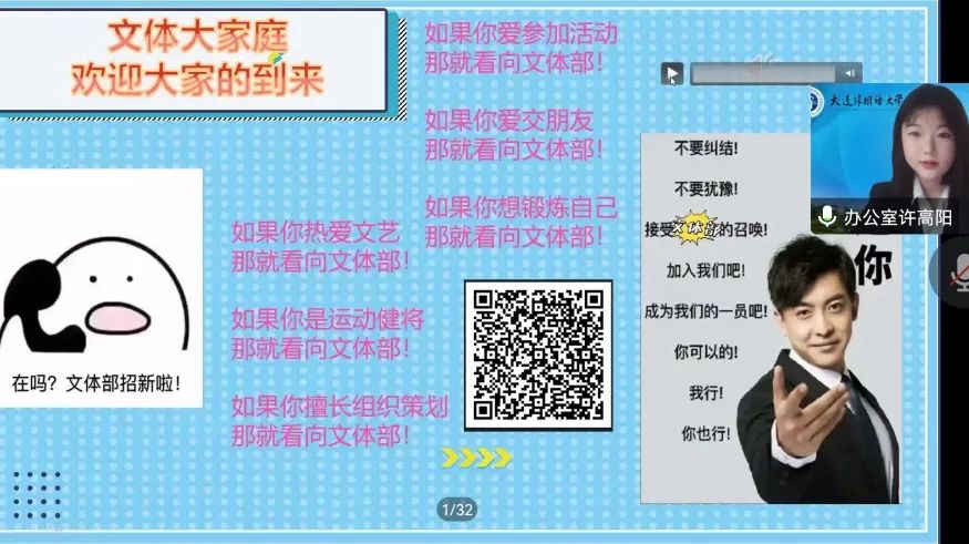 为了让新生更全面地了解分团委学生会,学院于线上召开学生组织招新专场宣讲说明会,各部门轮流展开部门介绍,从工作内容、部门要求、能力收获等方面为大家讲解,让同学们对意向部门有更加全面的了解。