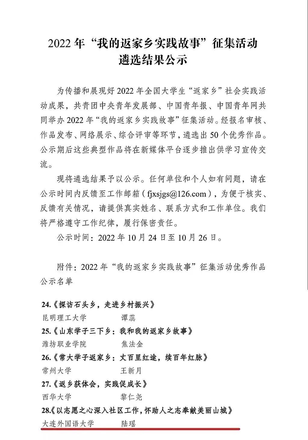 为传播和展现好2022年全国大学生“返家乡”社会实践活动成果,共青团中央青年发展部、中国青年报、中国青年网共同举办2022年“我的返家乡实践故事”征集活动。经报名审核、作品发布、网络展示、综合评审等环节,全国遴选出50部优秀作品。其中,我院陆瑶同学投稿作品《以志愿之心深入社区工作,怀助人之志奉献美丽山城》获此殊荣。