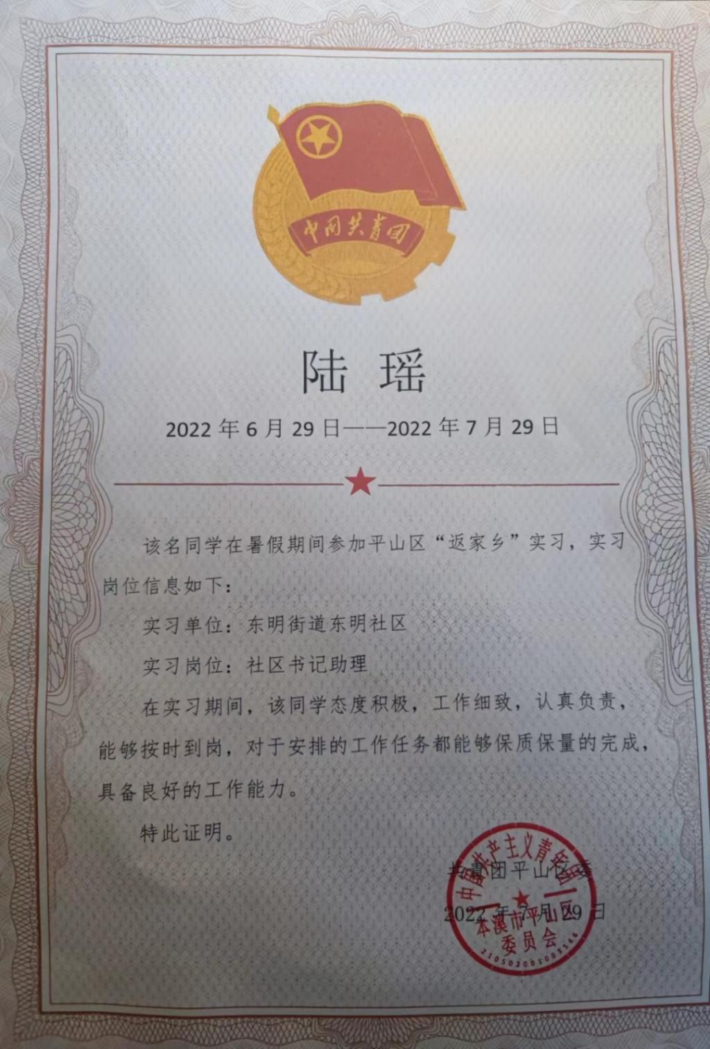 2022年假期,在辽宁省本溪市平山区政府以及学校对于大学生“返家乡”社会实践的共同倡导下,陆瑶同学积极投身“返家乡”社区工作中。在社会实践中,她先后参与社区核酸采集、文明出行督导、社区广告清理及居民信息核实等工作。在为期一个月的志愿服务中,她深刻体会到作为社区工作者的初心使命,也感受到家乡的发展和进步,并将自己“返家乡”实践经历写成属于家乡独有的实践故事,向全国宣传自己的家乡。