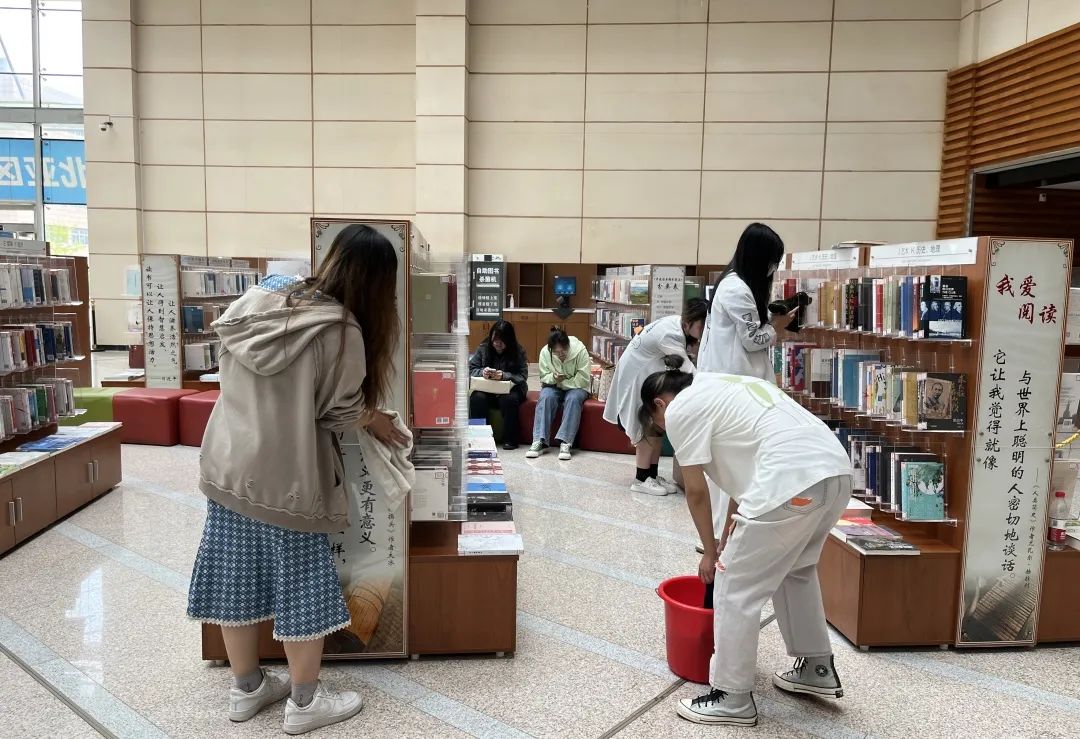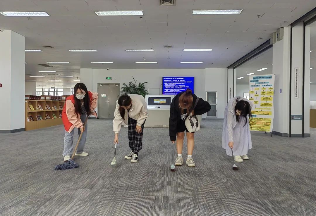 在自习室打扫过程中,大家始终保持着较高的劳动热情,对班级的门、窗台、地面、桌椅、走廊墙面等卫生区和卫生死角进行了认真清理;在图书馆劳动实践中,在听完工作人员的安排和注意事项后,同学们各司其职、积极合作,擦拭书架、整理图书、摆放桌椅,对图书馆进行“零噪音”清扫,不因卫生打扫而对学习的同学产生影响。