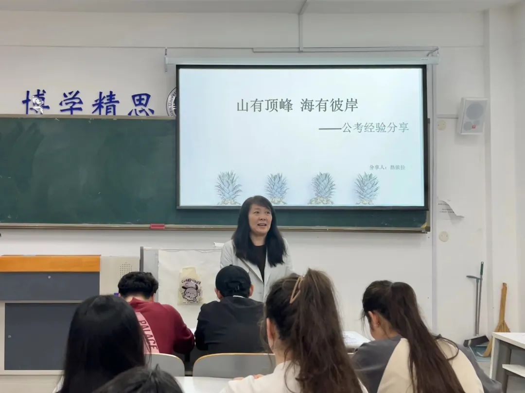 于励学楼503教室举办考公经验分享会,本次分享会邀请到学生处内派教师徐璟峰老师和2019级学生热依拉·阿迪力。