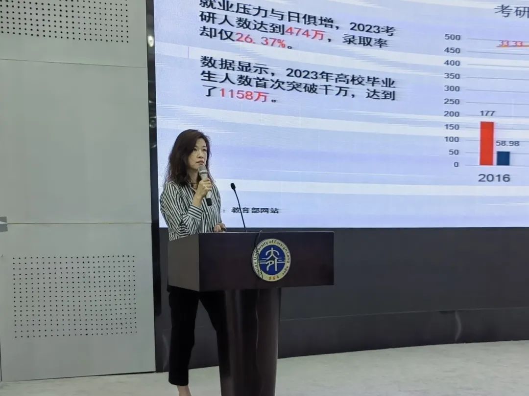 2023级新生辅导员于子容老师从学院23届毕业生就业、考研、出国出境情况、学院学风建设、安全教育、近期学校学院安排等方面进行介绍。希望家长和学院加强沟通交流,做好学生成长的积极关注者、有效沟通者、守望相助者,家校合力,共同为学生的成长和发展保驾护航。