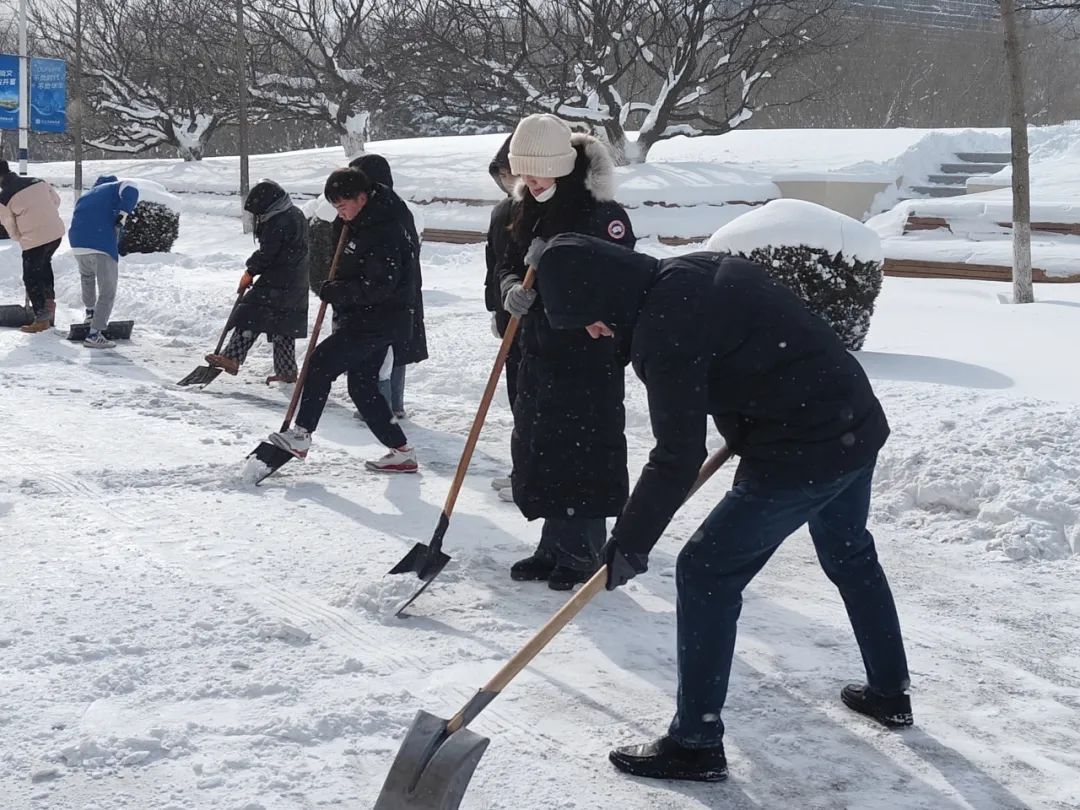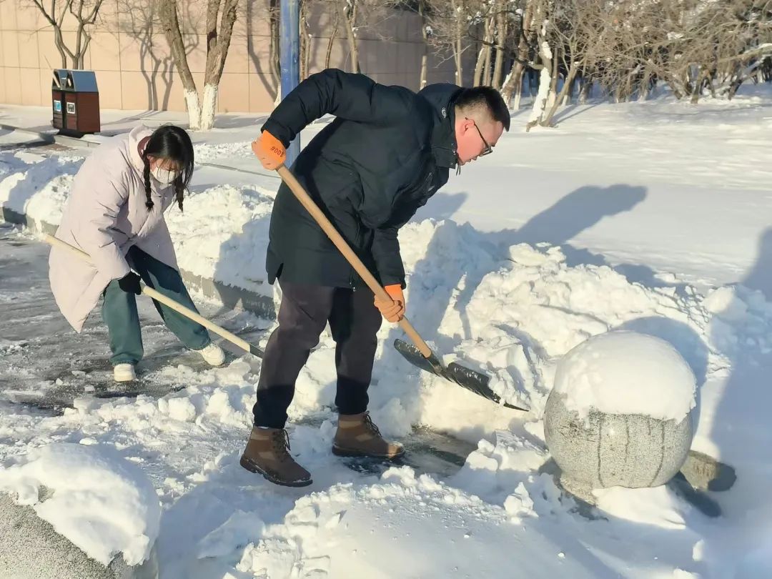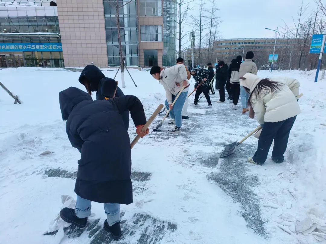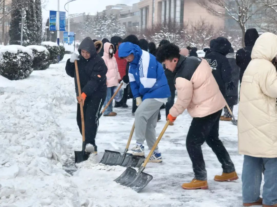 的同学们分为四批,从中午开始逐批清扫积雪。雪后的天气格外寒冷,但丝毫抵不过大家清除冰雪的热情,学院师生们相互协作,“包片划区”分小组,推、铲、扬、堆齐上阵,挥舞铁锹、手握清雪板,和铲雪设备配合“作战”,在冰雪覆盖的分担区内挥洒汗水,清除路面上的每一处雪,铲掉压实的每一寸冰。在大家的共同努力下,校园道路的积雪积冰被清除掉,一条条便于行走的道路重新出现在校园内,极大地方便了过往的师生和车辆,为全校师生的出行消除了安全隐患。