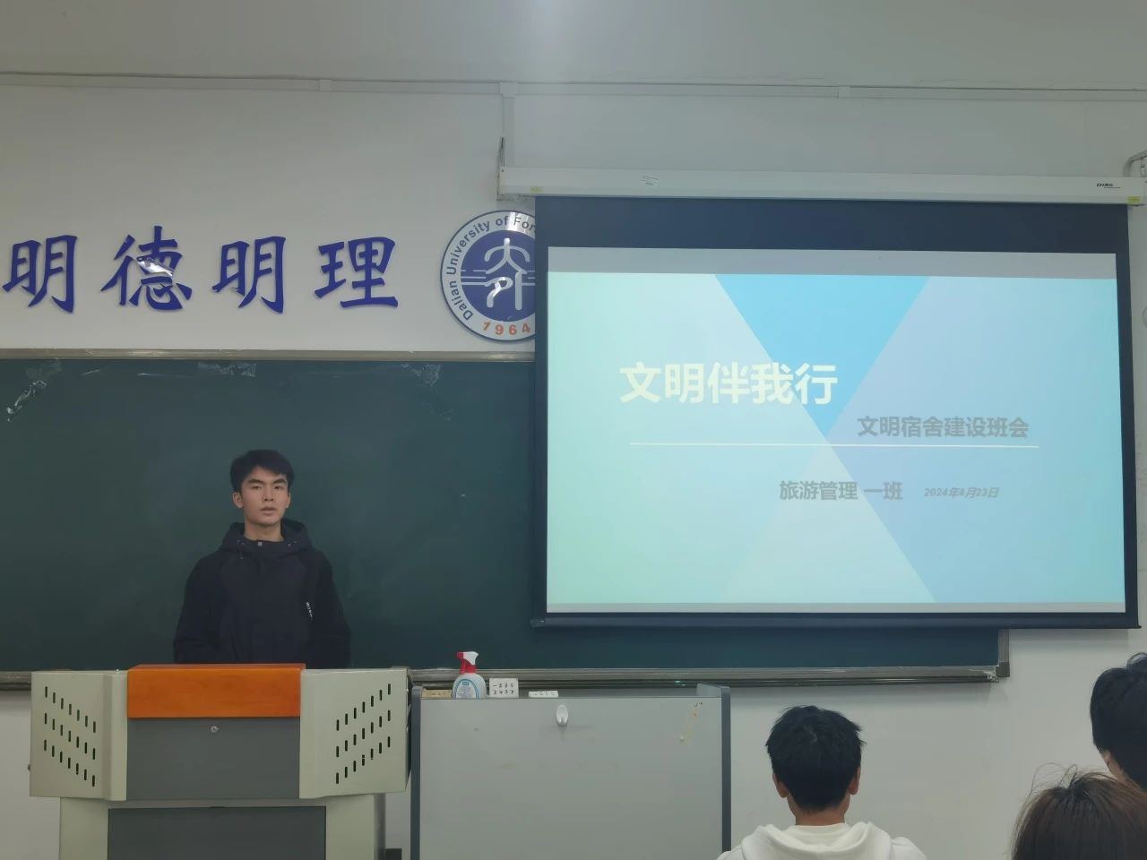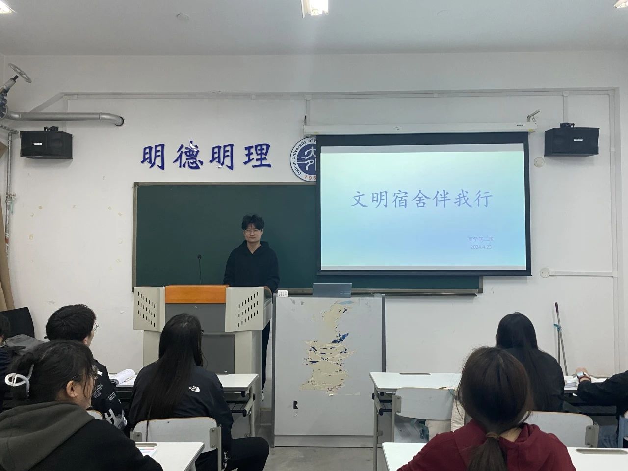 各班班干部从宿舍内务要求、用电安全、财产安全、寝室关系等方面向同学们讲解了建设文明宿舍的具体要求,提醒同学们要培养良好的卫生习惯,严格遵守《大连外国语大学学生公寓管理规定》,营造整洁舒适、文明安全、环境温馨的宿舍环境。