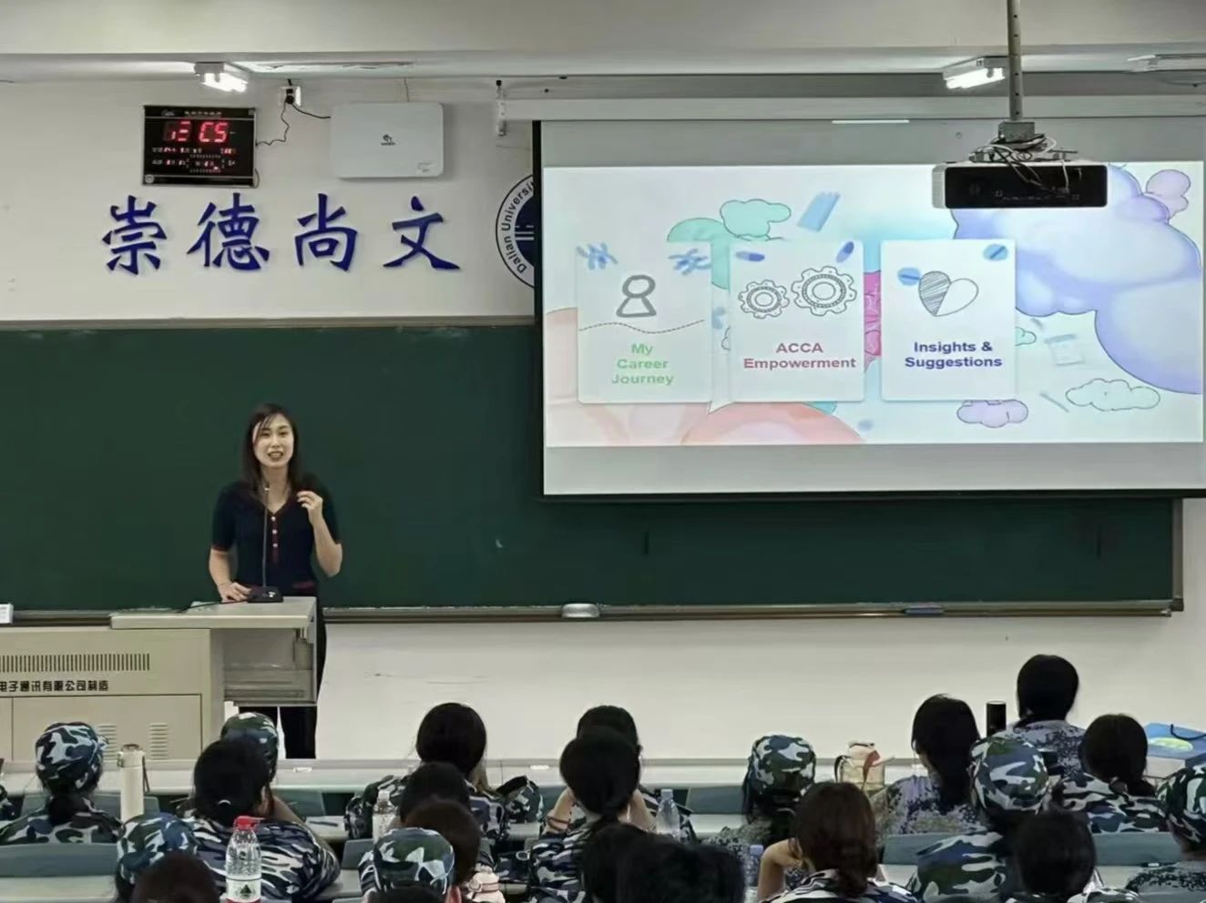 会议首先邀请到2012届优秀毕业生代表李博霖同学与大家分享学习ACCA的感受,她提到学习ACCA专业不仅塑造了专业能力、英语能力,而且可以考取资深会计证书,目前被社会广泛认可。此外,ACCA的专业知识可切实运用在实际问题中,提供了更加多元化的就业平台。希望学弟学妹们可以从自己的经历中汲取经验,提早计划好未来发展方向。