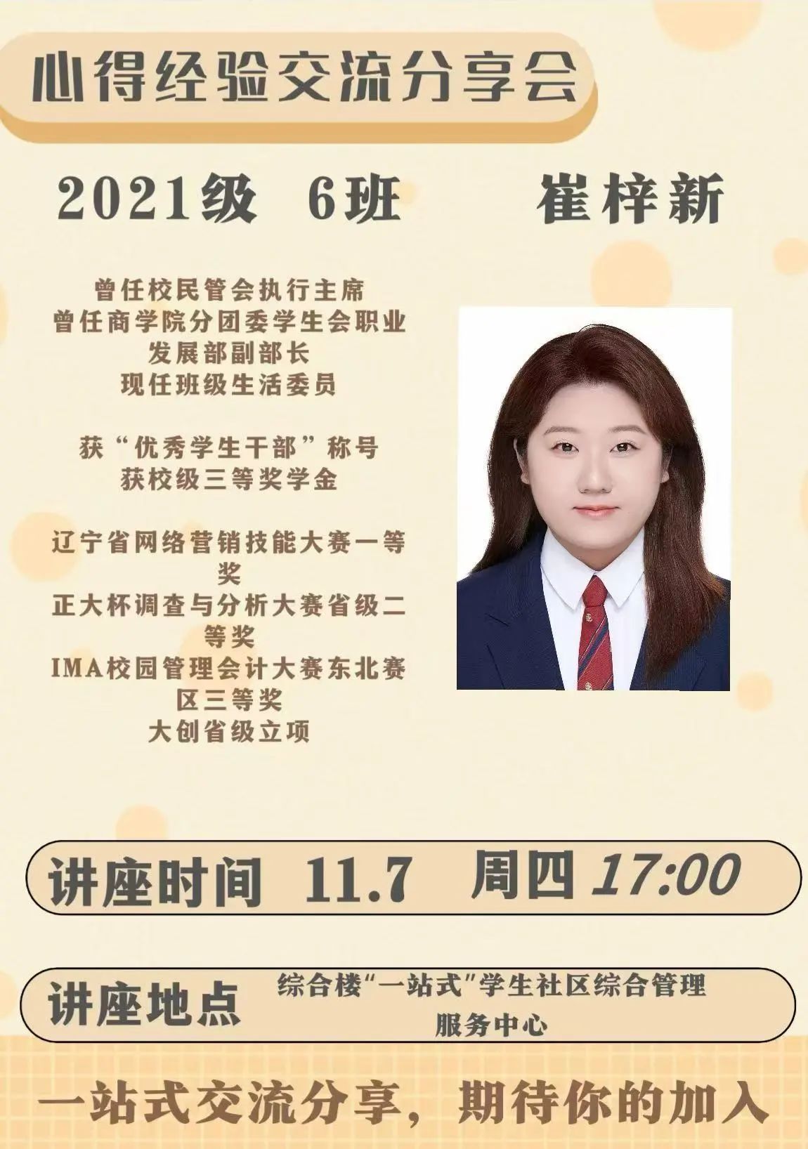 于综合楼“一站式”学生社区综合管理服务中心开展“一站式”就业引航商赛经验分享会,本次分享会由21级6班崔梓新同学主讲。