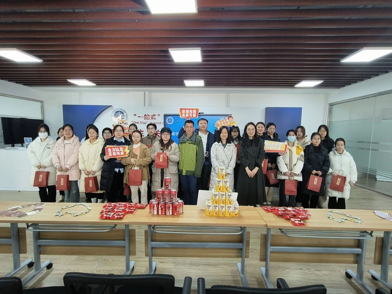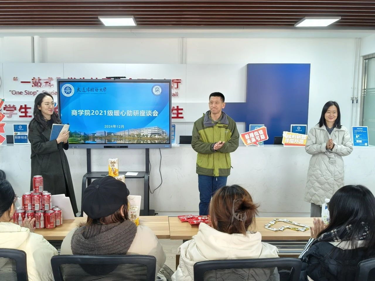 于综合楼一站式服务中心开展“研”途递暖——考研暖心慰问活动。本次活动由21级辅导员钟俊英主持,党总支书记贾哲、党总支副书记王欣悦参与本次活动。