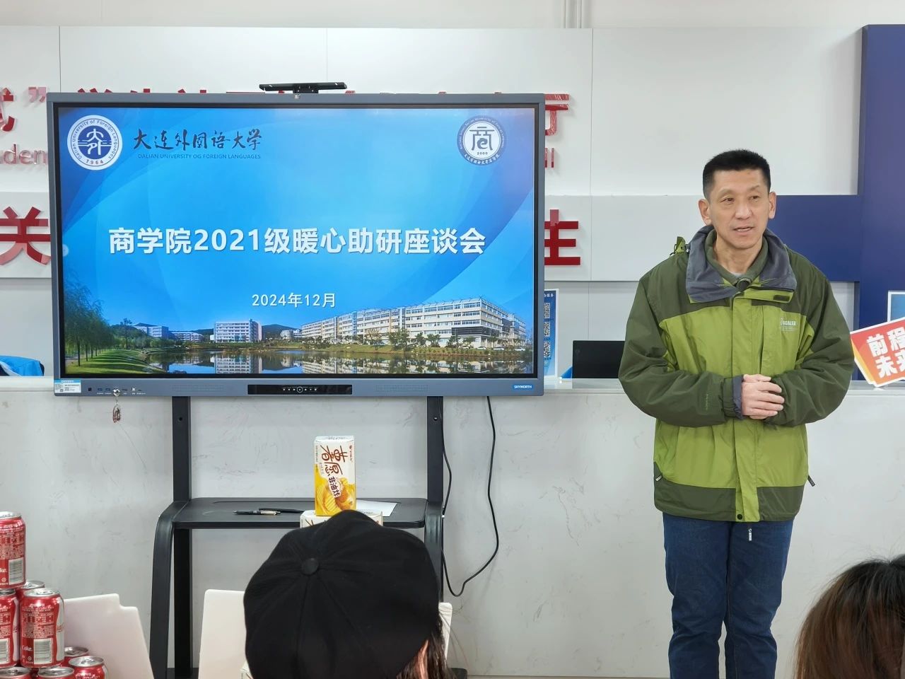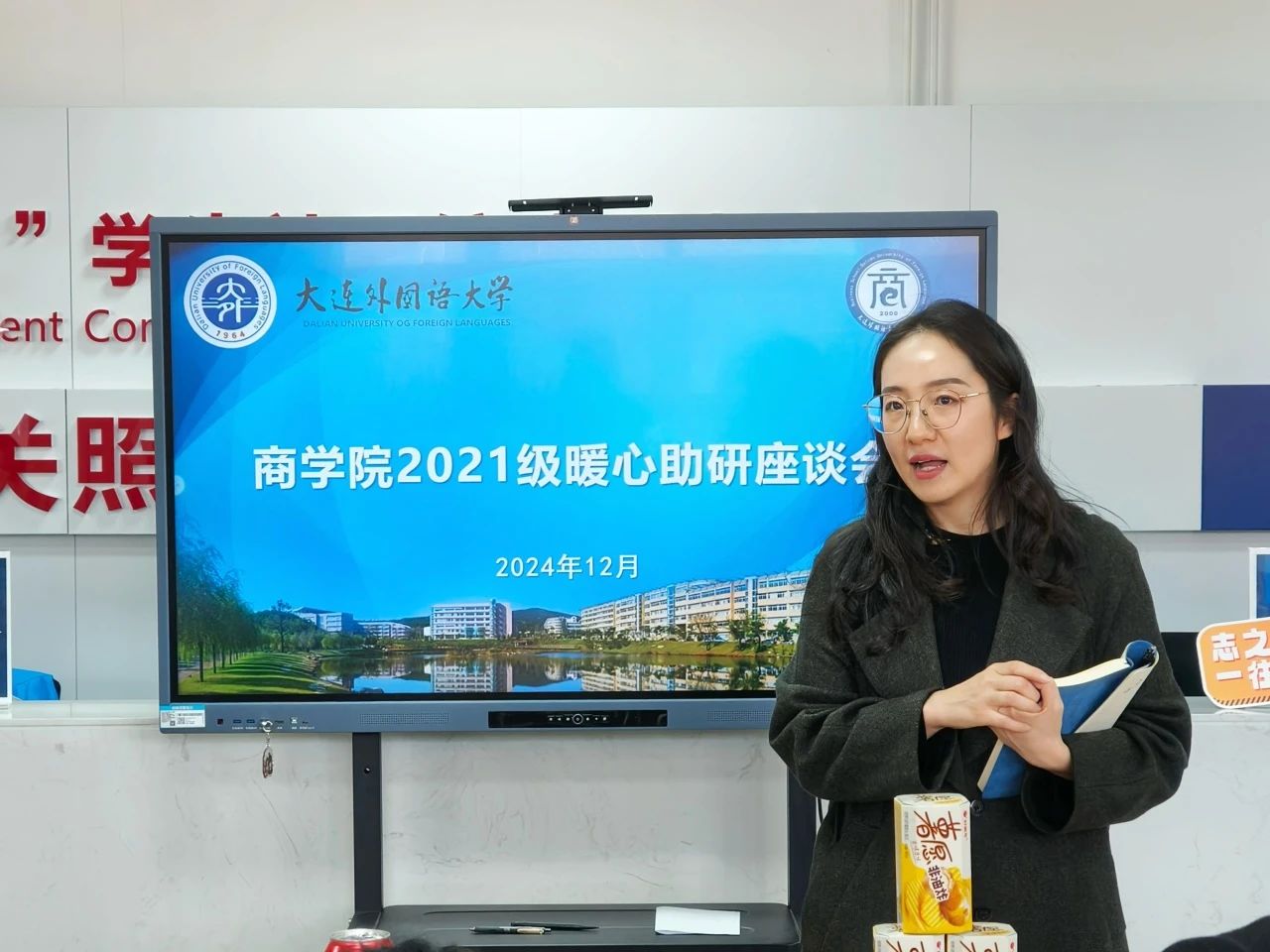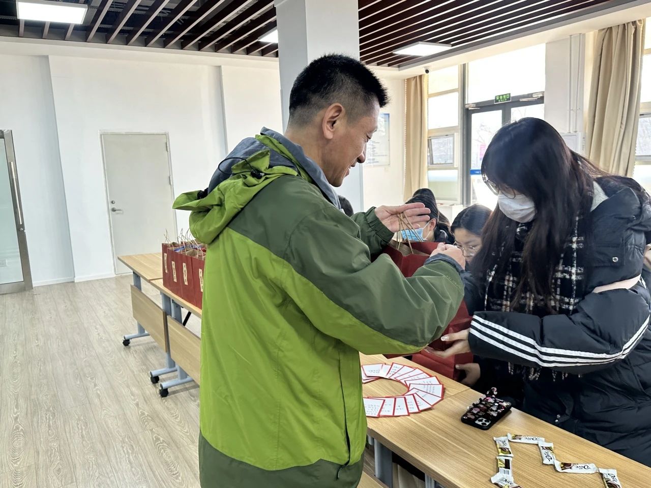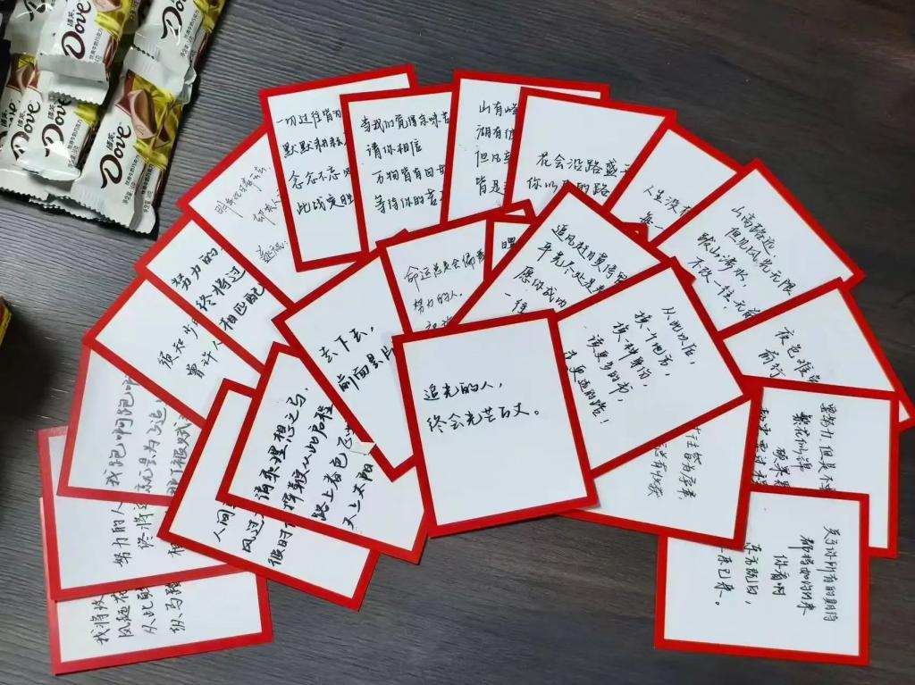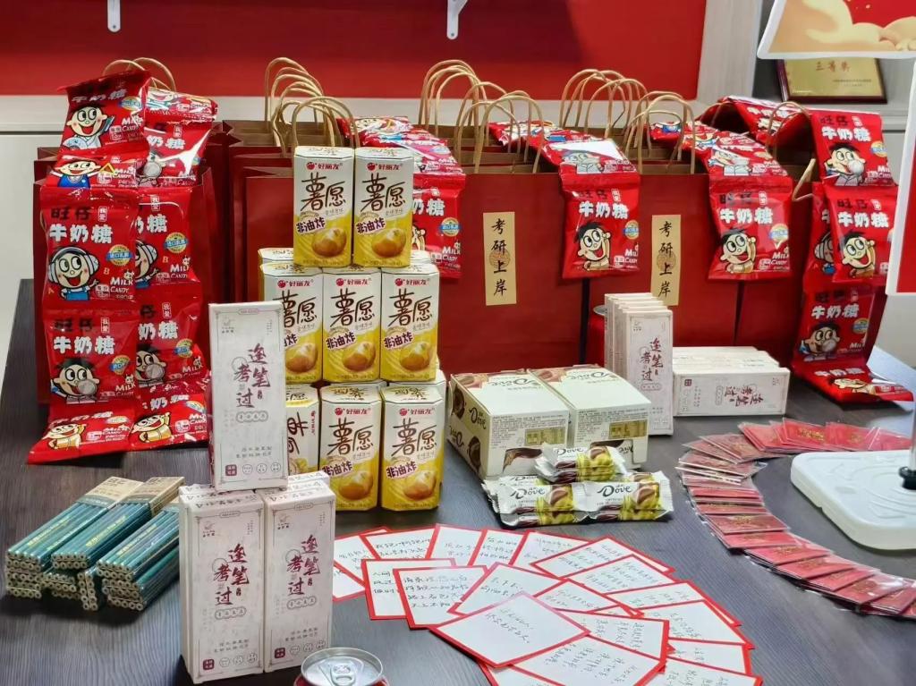 活动伊始,钟老师向大家介绍了加油包的寓意——旗开“德”胜的德芙巧克力、运“旺”时盛的旺仔牛奶糖、如“愿”以偿的薯愿、带有定制祝福语的可乐和文具,以及同学们亲笔写下的贺卡和精心准备的金属书签。她表示学院会在各方面为考研学子提供温暖和支持,做同学们最坚实的后盾。