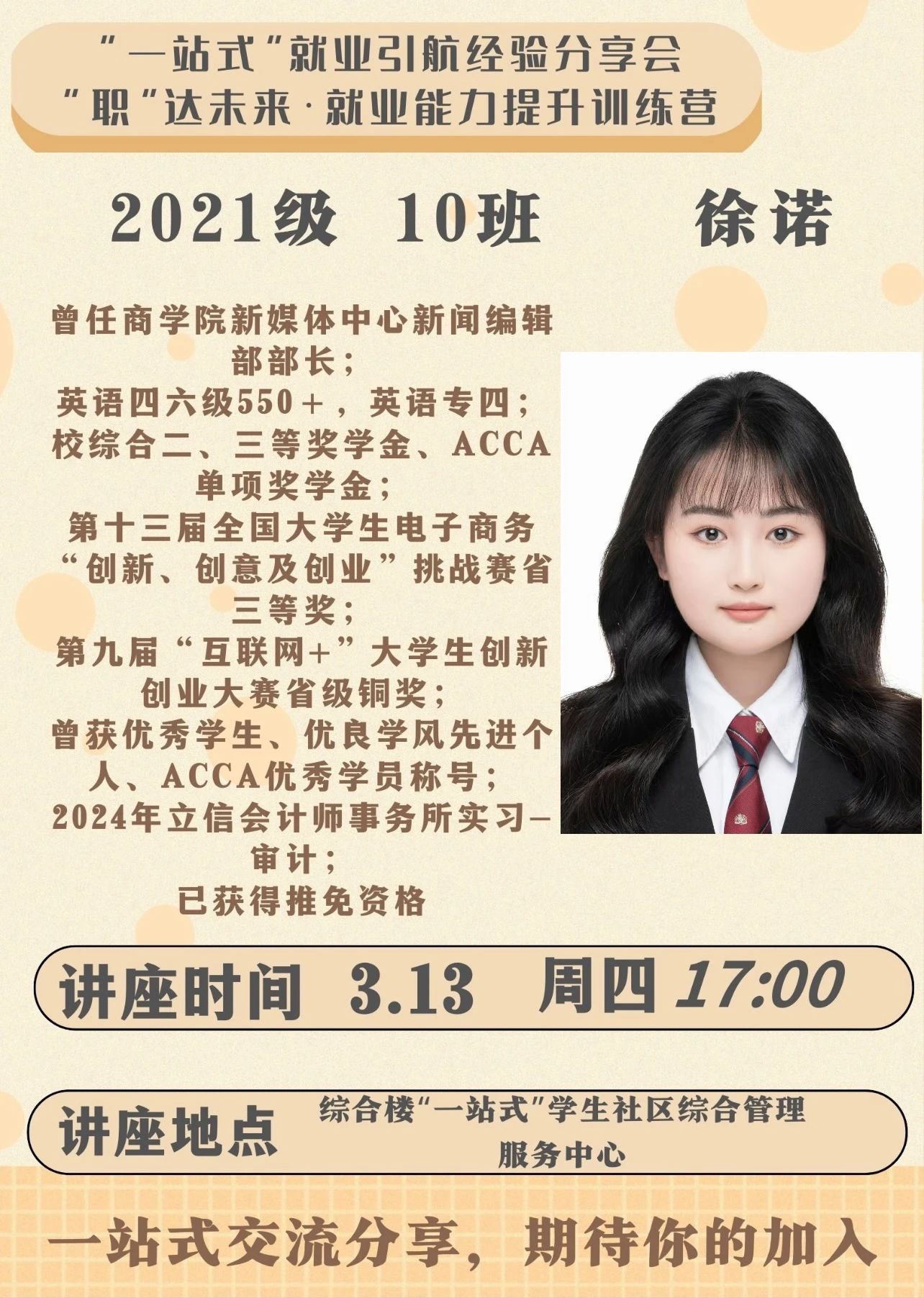 最后,徐诺同学分享了个人的实习心得。她提出精进英语听力能力和参与实习都有助于个人能力提升,助力求职并建立人脉,并鼓励同学们勇于尝试,将所学知识运用到实践中,不断提升自己的综合素质。