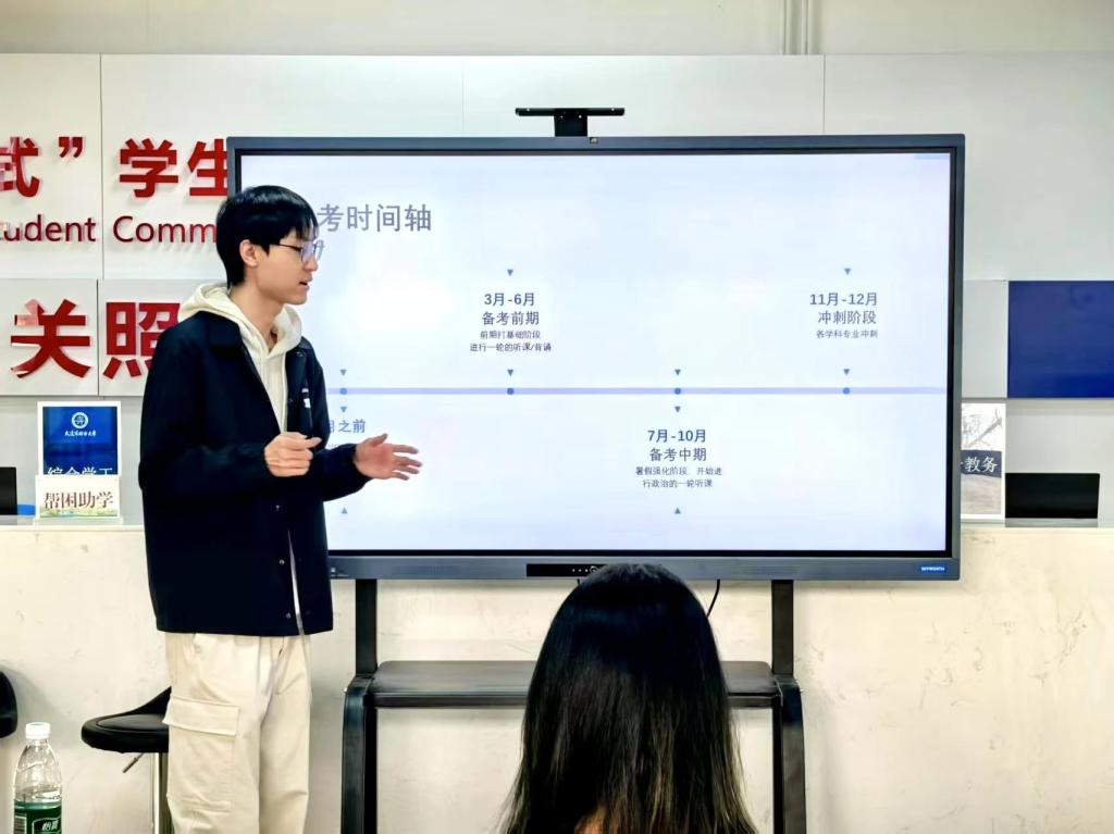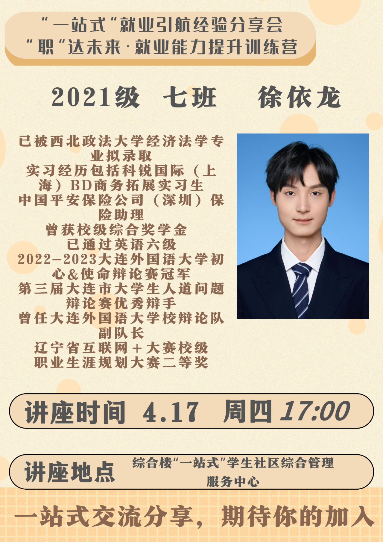 于“一站式”学生社区综合管理服务中心开展“一站式”就业引航“职”达未来就业能力提升系列活动第四期——考研经验分享会,本次分享会由21级7班徐依龙同学主讲。