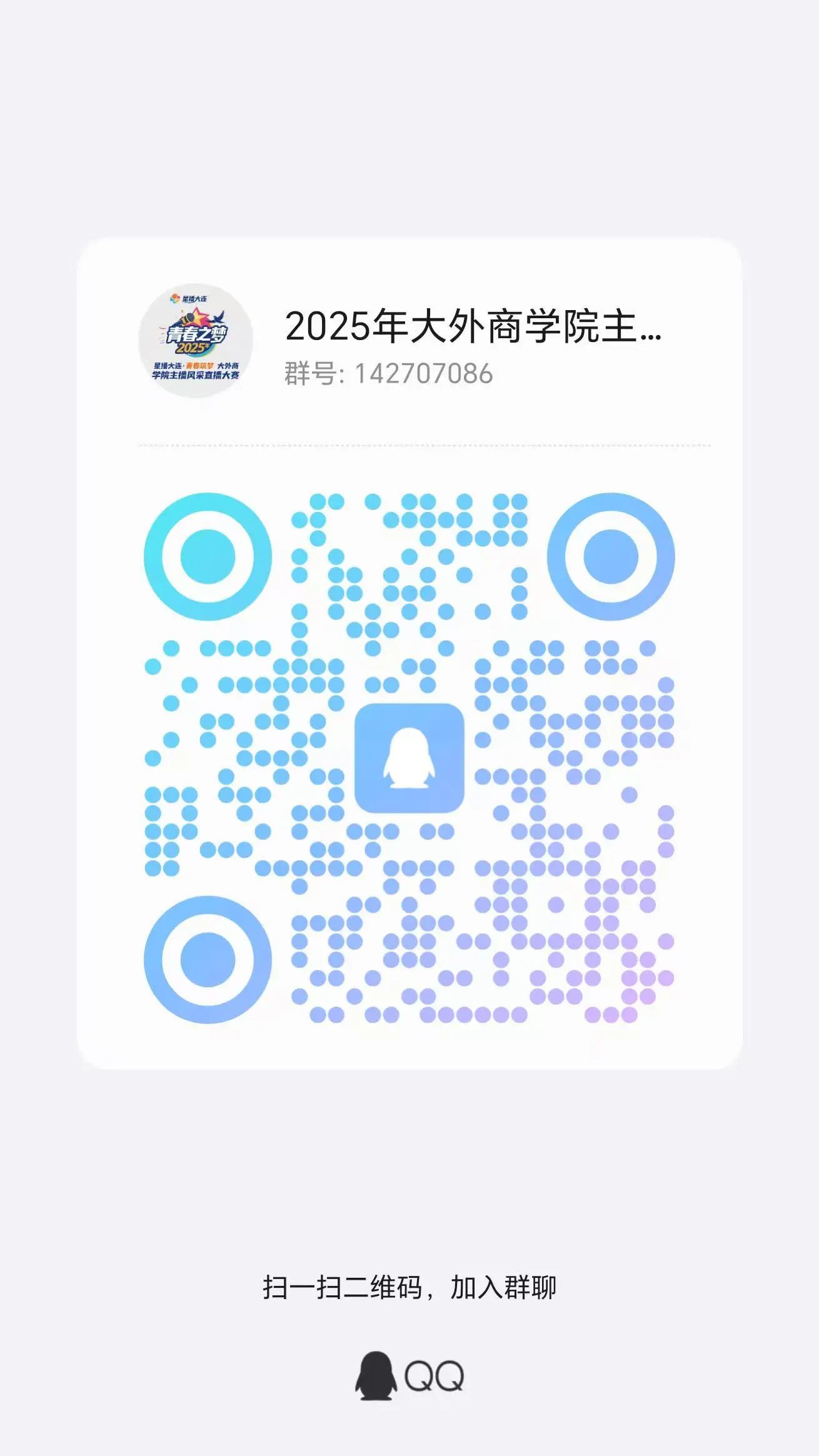 1、参赛同学需扫码进群,更改群内备注为“学院+年级+专业+姓名”,方便接收后续通知。
