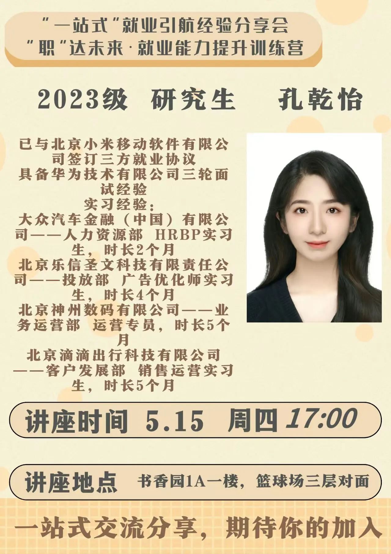 于“一站式”学生社区综合管理服务中心开展“一站式”就业引航“职”达未来就业能力提升系列活动第五期——就业引航经验分享会,本次分享会由23级研究生孔乾怡同学主讲。