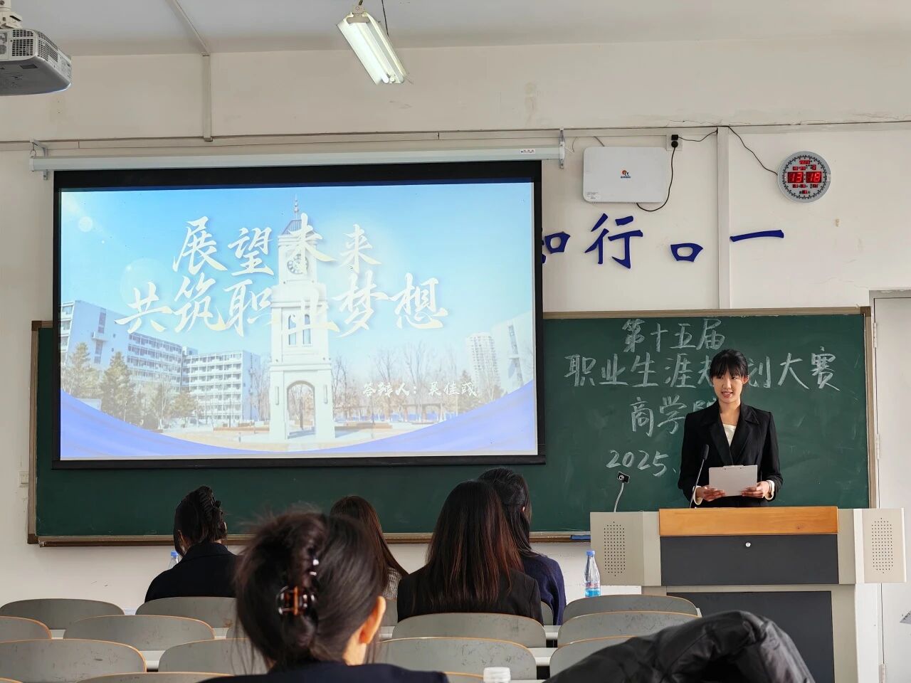 经前期简历初筛,71位选手脱颖而出晋级决赛。决赛环节分为“主题演讲”与“评委答辩”两部分,选手围绕“自我认知、职业认知、未来规划”三大维度,以PPT演示结合现场演讲的形式,深度剖析个人职业兴趣与能力优势,结合目标行业发展前景及岗位需求,清晰呈现个性化职业发展规划,展现出商院学子对未来的清晰思考。
