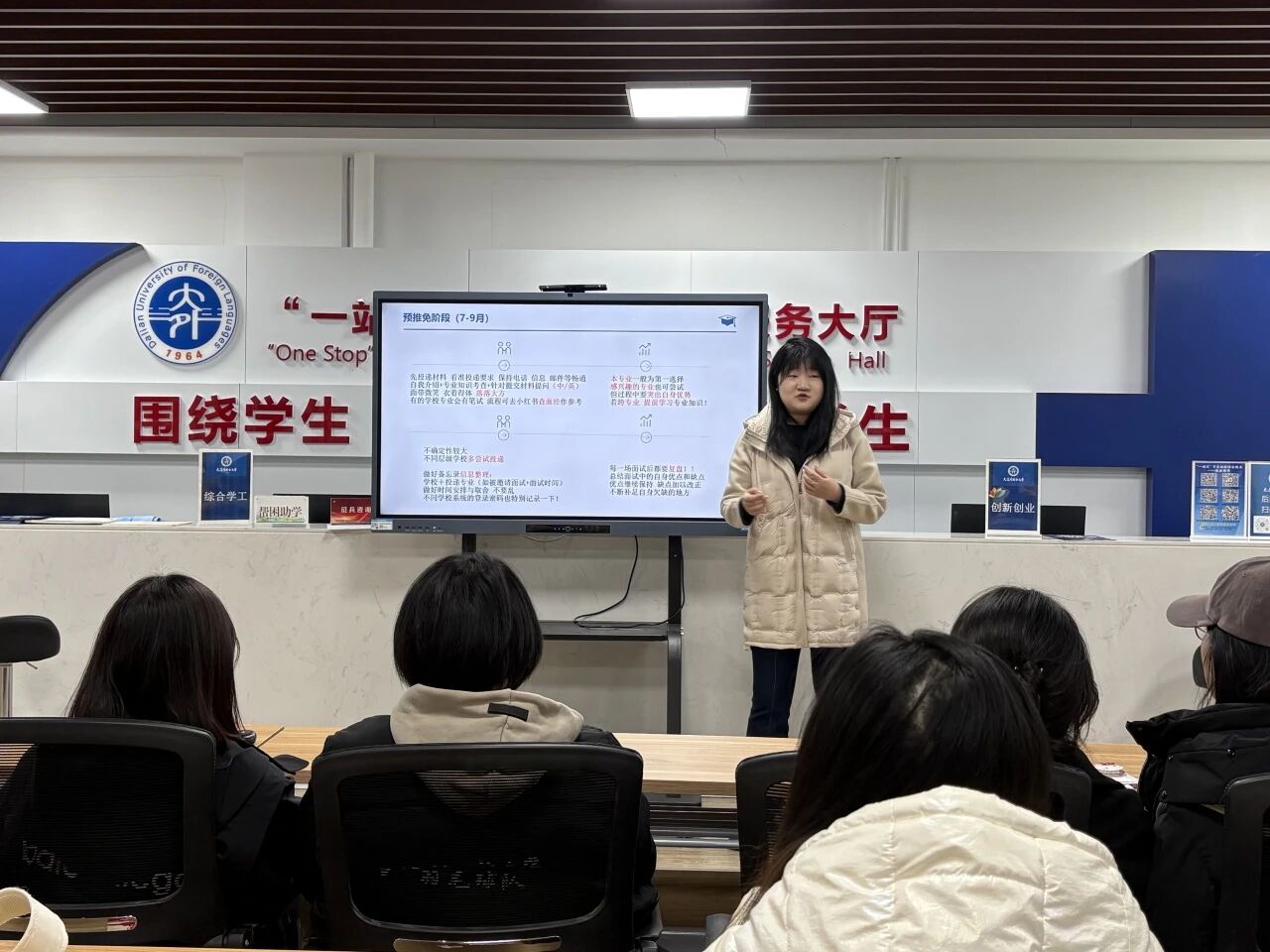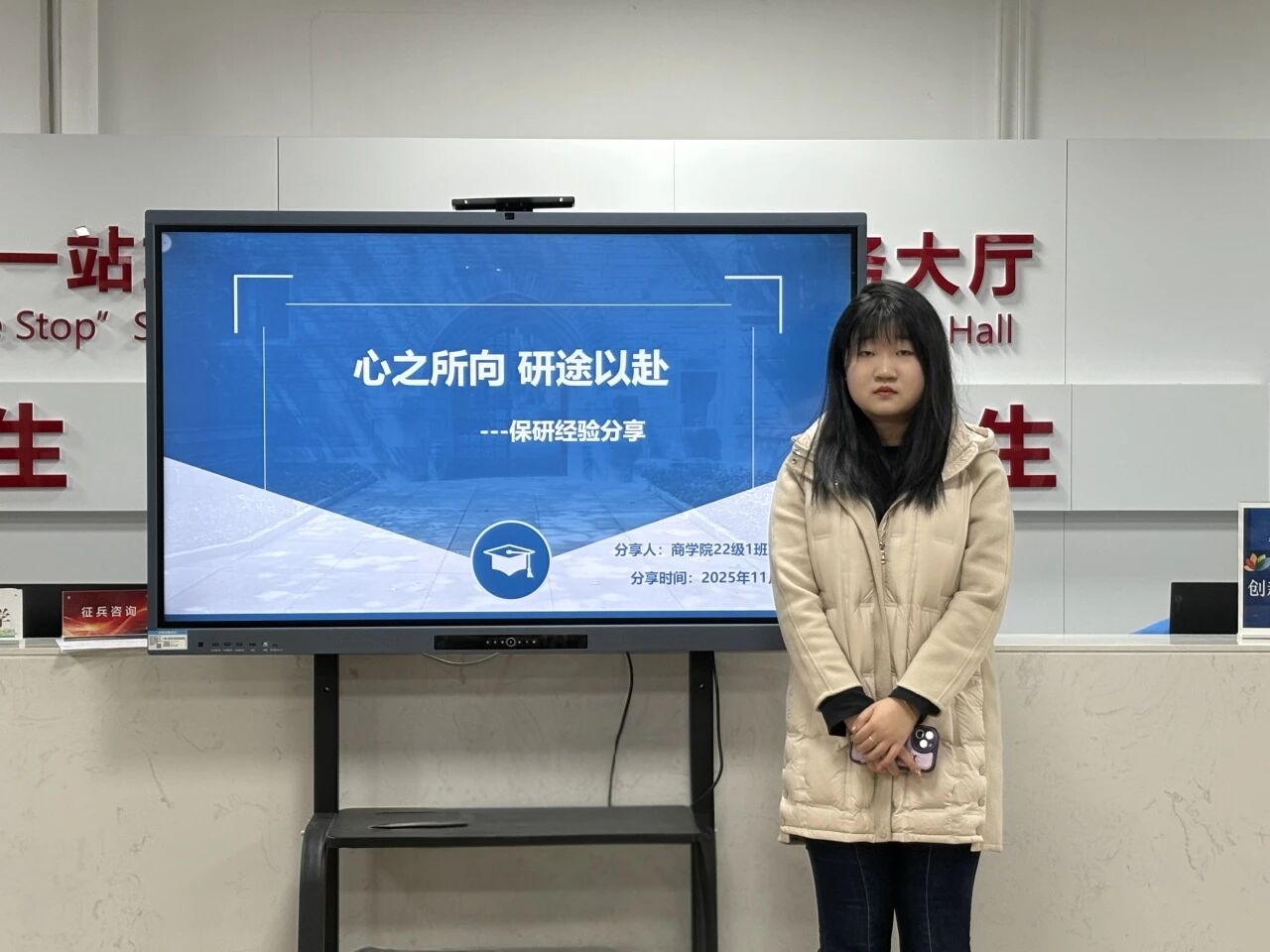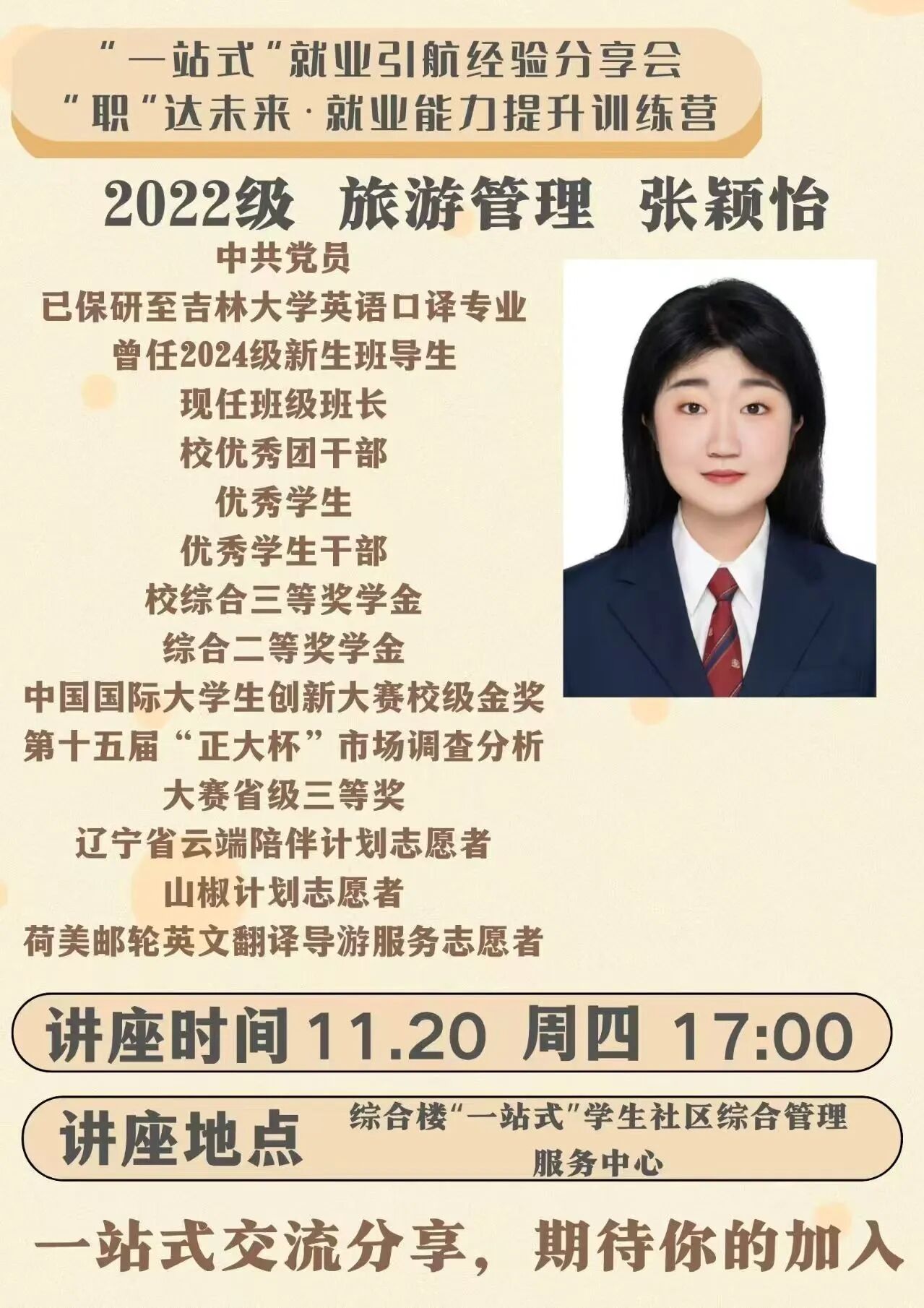于“一站式”学生社区综合管理服务中心开展“一站式”就业引航“职”达未来·就业能力提升系列活动第九期——保研经验分享会,本次分享会由22级1班的张颖怡同学主讲。