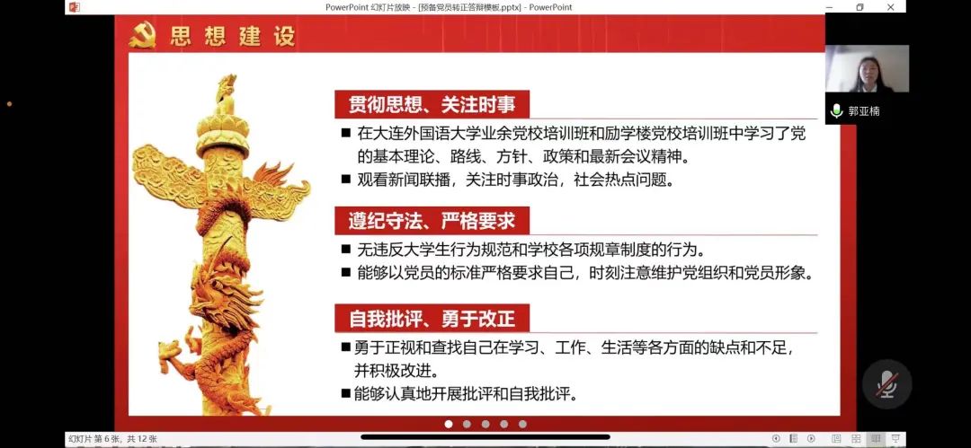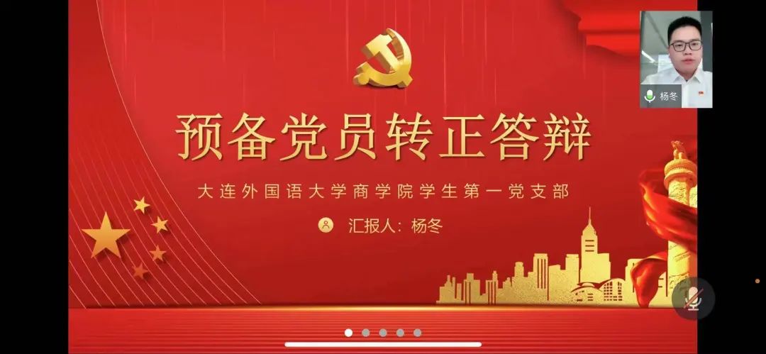 大会开始,预备党员依次从个人履历、思想建设、综合表现等方面,汇报了各自在一年预备期中的表现情况。分享他们对党员身份的认识和在学习、生活中取得的成就;通过参加社会实践、暑期实习,努力提高自身综合素质;坚持以切实行动投身于党史学习教育中,汲取丰厚滋养,强化理论武装;并分析了自己的优缺点,进行总结反思,端正内心,以正确的思想指引自己不断前行。