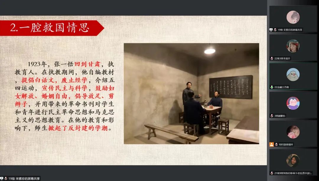 本期谈心室,宋素珍同学以“革命星火燎陇原”为主题,带领我们学习了甘肃的红色历史,并详细介绍了革命前辈张一悟的英雄事迹。张一悟是甘肃党组织的创始人、是甘肃最早的共产党员,为甘肃党组织的建设、发展和马克思主义在甘肃的传播,都做出了重要的贡献。历史照亮未来,征程未有穷期。通过重温红色记忆、讲述感人故事引导同学们铭记历史、缅怀革命先烈、感受革命年代的气息。身临其境地感受老一辈革命家的奋斗精神,珍惜新时代来之不易的幸福生活,不断激励广大青年传承红色精神、凝聚奋进力量。