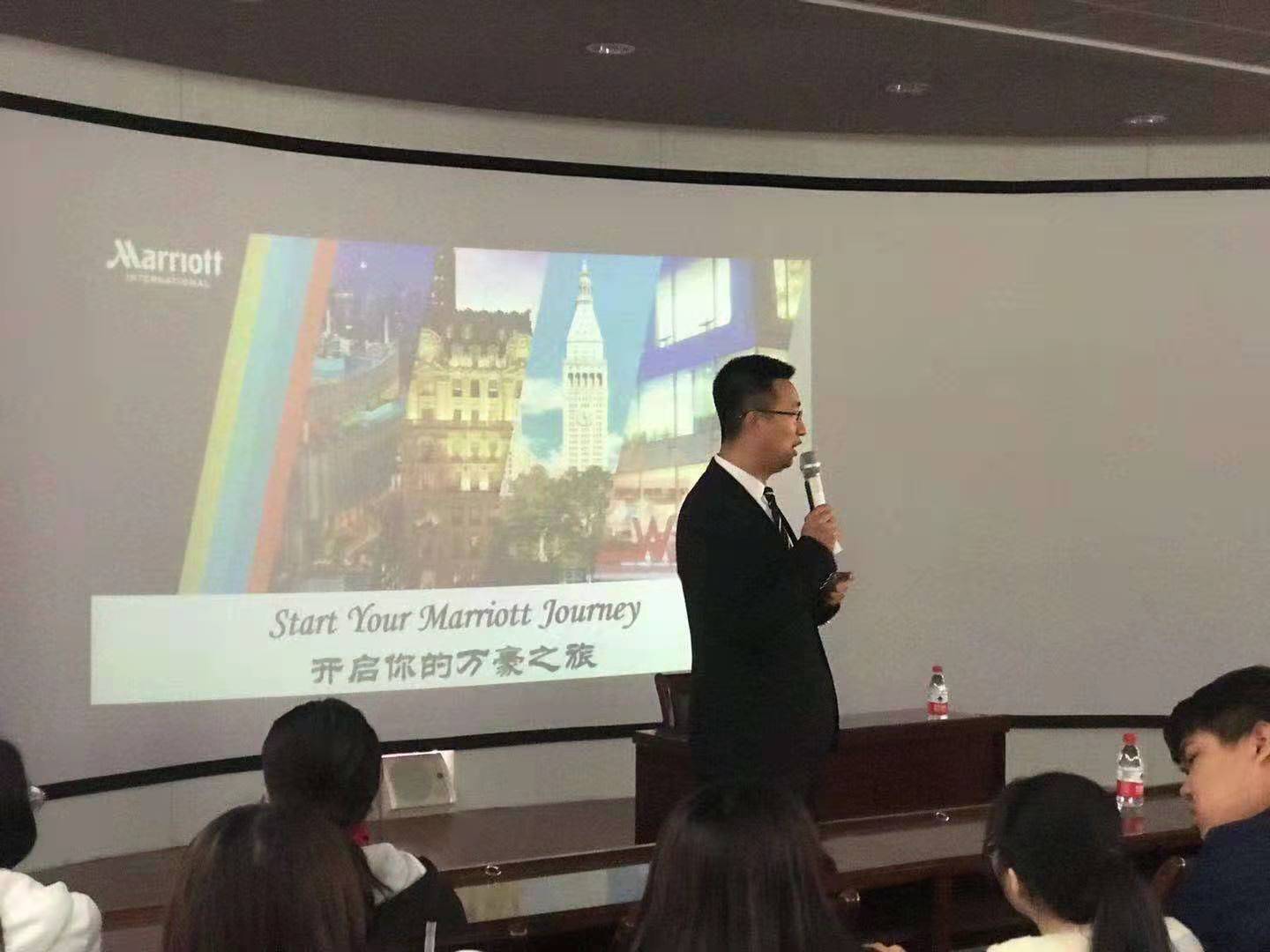 讲座伊始,大连一方城堡豪华精选酒店培训经理为大家讲述了万豪集团的“以人为先、追求卓越、拥抱改变、诚信经营、服务世界”的核心价值理念,分享了万豪集团从汽车旅馆一步步发展成为现如今世界最大最豪华的酒店管理集团之一的发展历程。酒店总经理Susanna分享了自己的成长经历和职业发展历程,鼓励同学们选择自己喜欢的事情,并持之以恒坚持下去,坚定地朝着理想不断努力。讲座中,同学们专心聆听,颇受启发,在问答环节积极用英语向总经理提问。