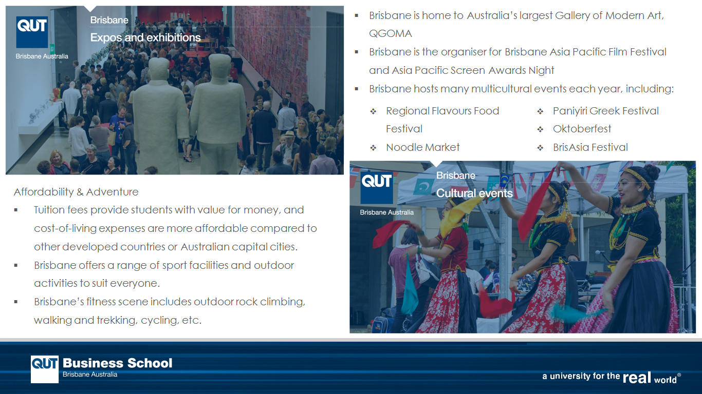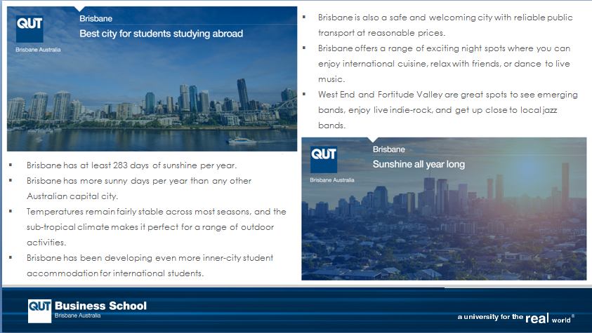 布里斯班有230万人口,是澳大利亚第三大都市,也是一个充满活力而又具有多元文化的城市,是生活与求学的理想之地。布里斯班与黄金海岸和阳光海岸均仅有一个小时车程的距离。2014年G20峰会曾在此举办。2016年QS公布的“全球最佳留学城市”排名中,布里斯班位列全球前二十。