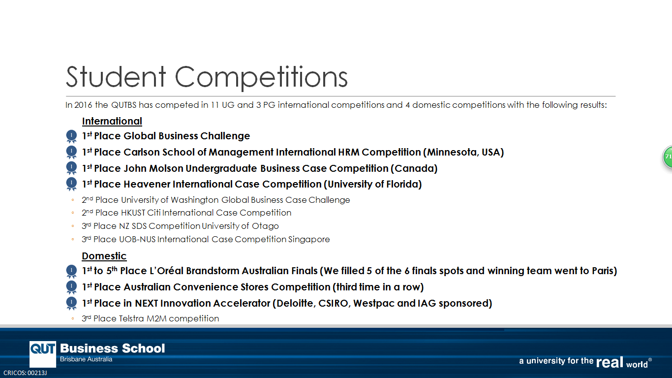 在2016年《QS世界大学排名》中,QUT多个专业获得全球领先排名: