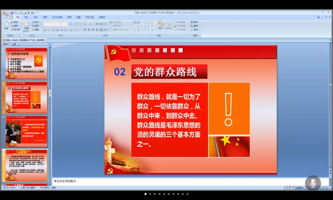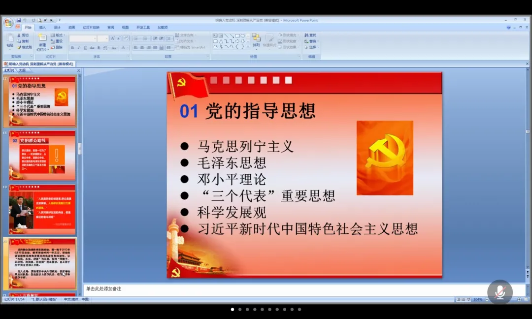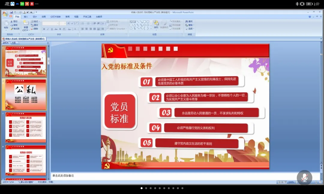 课程期间,贾书记通过线上互动提问的方式,与各位入党积极分子进行沟通交流,并结合党的发展历程,从入党动机、入党流程、全面从严治党三个方面,具体讲述了入党的标准及条件和党员的权利与义务,介绍了党的建设中全面从严治党的重要理念,尤其要求入党积极分子在“党史学习教育”中做到学史明理、学史增信、学史崇德、学史力行。贾书记希望各位入党积极分子能够系统地学习党的历史和理论知识,切实端正入党动机,把党员的标准融入到实际行动中去,力争早日成为一名合格的中国共产党员。