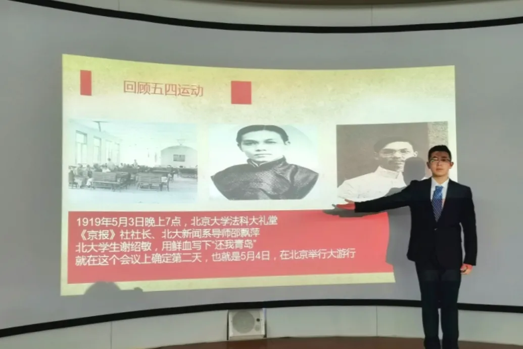 接着,谷泽煜通过电视剧《觉醒年代》中讲述五四运动的视频片段,让我们再次身临其境,视频中北大学生郭心刚(原型郭钦光)带着病体仍然坚持全程的爱国游行活动,给我们留下了深刻的印象。