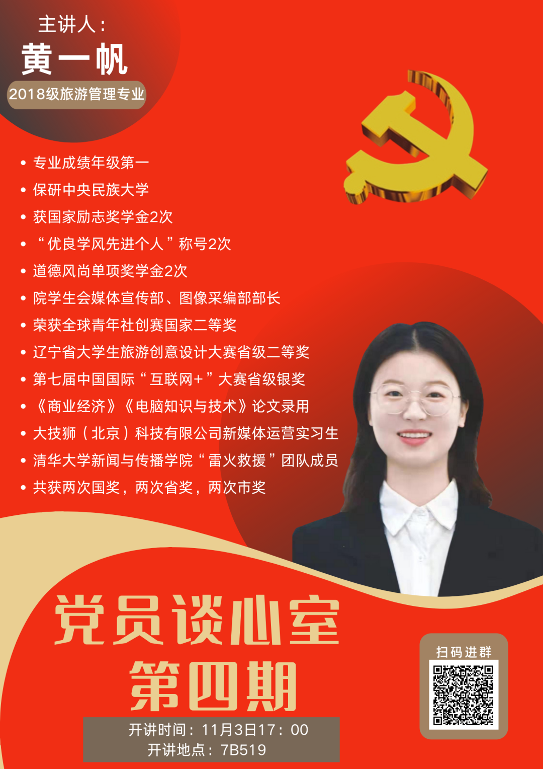 本期党员谈心室活动我们有幸邀请到了18级学生党员黄一帆同学,现在让我们一起聆听她的精彩分享吧。